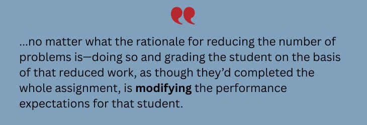 The problem is that—no matter what the rationale for reducing the number of problems is—doing so and grading the student on the basis of that reduced work, as though they’d completed the whole assignment, is modifying the performance expectations for that student. And there is an assumption that the teacher’s assignment for students to demonstrate mastery over multiple attempts is not an appropriate or reasoned standard.