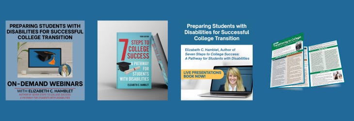 Find lots of free content about preparing students with disabilities for college success on Elizabeth’s main blog and Youtube channel. To learn much more, read Seven Steps to College Success: A Pathway for Students with Disabilities, watch my on-demand videos, read her concise 6-page guide, or hire her to speak to your school, group, or district.